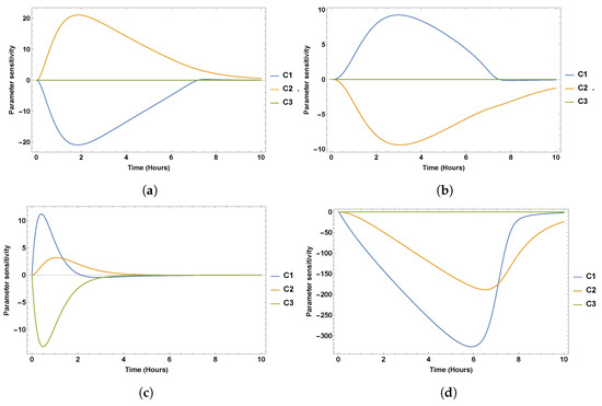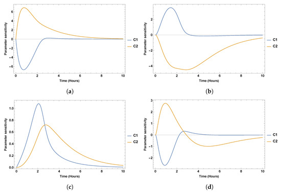 with and . Equation (13) is solved using different parameter values and the sensitivity coefficients are calculated [17]. For example, the first order sensitivity to the parameter is