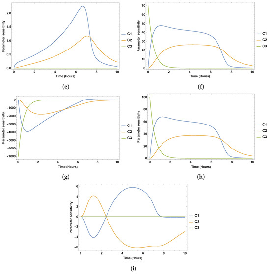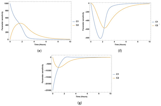 Lastly, we consider the parameter sensitivity of the oral administration model. The bioavaliablity fraction, F and the dose, D, follow the same pattern. Both the F and D are obtained in the initial condition, indicated by Figure 5f,h. Further, the maximum rate of elimination, and the Michaelis–Menten constant, , exhibit the same pattern but have the opposite signs. These parameters are part of the Michaelis–Menten function as shown in Figure 5d,e. An oscillatory behaviour of fractional-order, , is observed.