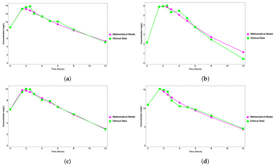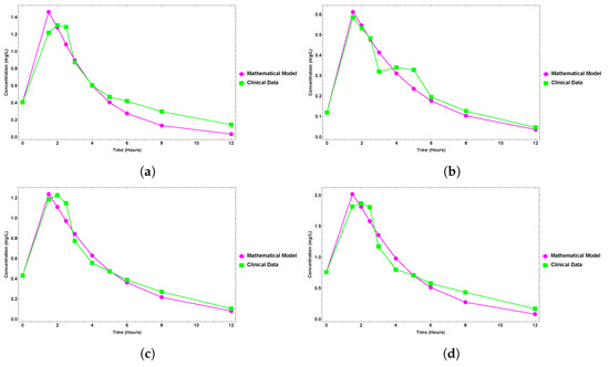 Figure 6a indicates some correlation between the standard dose and co-administration of RTV greater than the standard dose with rifampin. Further, there is a better fit in Figure 6c. Figure 6b appears to be different compared to the other dose measurements; however, the mathematical model and clinical data started at the same measurement and differed after 2.5 h. Furthermore, they followed the same behaviour pattern for approximately 5 h.