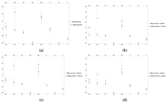 Figure 8 indicates that and had very similar results for all ten runs, which resulted in a significantly low variance for both ritonavir and lopinavir. The variance of lopinavir is higher than that of ritonavir except for bioavailability, F. Figure 8b suggests that the variance of all the other parameters increased except for F; however, F overlaps with the other parameters, indicating no significant differences between the clinical data and mathematical parameters for the ritonavir. However, for the lopinavir, there was a reduction in the parameter value differences among , and F, while the variance between and increased. Opposite to the observation in Figure 8a, the fractional order, , increased for lopinavir. Most of the variance in the parameter remained in a similar range for Figure 8b,c; nonetheless, the variance of increased, while the variance decreased for ritonavir. Further, the lopinavir bioavailability, F, value decreased in Figure 8c compared to Figure 8b and reached a constant value throughout all the runs, resulting in no variance. From Figure 6d, we can conclude that as the concentration of ritonavir increases, so does the variance in parameters except for , which dropped, and the fractional order, , which remained very similar.