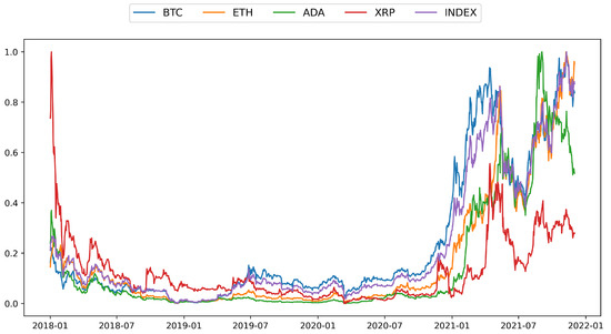 Figure 1 shows the dynamics of the min–max scaled closing price of five representative cryptocurrencies, including Bitcoin (BTC), Ethereum (ETH), Cardano (ADA), Ripple (XRP), and the Cryptocurrency LargeCap Index (INDEX). The closing prices of the cryptocurrencies were obtained from coinmarketcap.com, whereas that of the INDEX was obtained from spglobal.com. The experiment period was from 1 January 2018 to 1 December 2021, consisting of bearish, sideways, and bull markets in chronological order. The period that includes various market conditions can produce comprehensive results of asymmetric multifractal behavior. Cryptocurrencies are traded 24/7, but the market index provided by the S&P is only traded on business days. Thus, we utilized 1023 daily closing prices limited to business days. The daily price dynamics of all cryptocurrencies varied with the same trend. Interestingly, the price of the INDEX represented the weighted average of the prices of all cryptocurrencies well. The price change in the INDEX appeared to be highly affected by that of BTC, consistent with the fact that the market capitalization of BTC overwhelmed that of others.