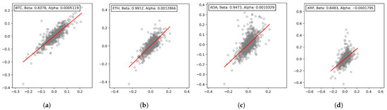 Figure 2 shows the CAPM filtering of the market returns on the cryptocurrency returns. The gray circles represent the returns of the market and the individual cryptocurrency on the x and y axes, respectively. The solid red line represents a fitted regression line. The slopes of BTC, ETH, ADA, and XRP are 0.838, 0.991, 0.947, and 0.848, respectively, indicating the effectiveness of filtering the linear influence from the returns of the INDEX to that of cryptocurrencies. Therefore, as in Equation (3), of four cryptocurrencies can represent an idiosyncratic risk premium.