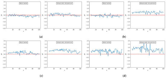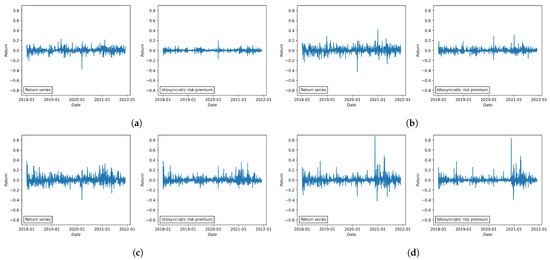 Daily return series and idiosyncratic risk premium of each cryptocurrency. (a) BTC. (b) ETH. (c) ADA. (d) XRP.