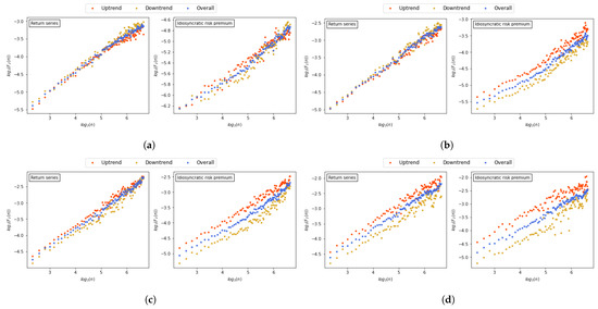 Figure 4 shows a change in with respect to the change in using the index-based A-MFDFA on the original return series and idiosyncratic risk premium of each cryptocurrency when . Note that the red, yellow, and blue dots indicate the uptrend, downtrend, and overall trend, respectively. In the case of the original return series, the fluctuation of each trend was not clearly distinguished except for XRP. Specifically, BTC and ETH showed a larger downtrend fluctuation than uptrend fluctuation, whereas ADA and XRP showed the opposite. Unlike the stock market as in [9,30], the representative cryptocurrencies showed weak evidence of asymmetric volatility in the original return series. On the contrary, in the case of the idiosyncratic risk premium, the fluctuation of each trend was more clearly distinguished than the original return series for all cryptocurrencies. Specifically, all cryptocurrencies showed a larger uptrend fluctuation than a downtrend fluctuation. The results of the idiosyncratic risk premium was consistent with the work of [43], who discovered an increase in the volatility of cryptocurrency after positive shocks using the asymmetric threshold generalized autoregressive conditional heteroskedasticity and quantile regression.