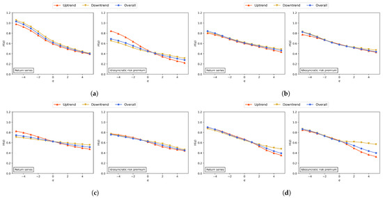 At first, we investigated the generalized Hurst exponents of the overall trend(), uptrend(), and downtrend() for q in Figure 6. In the case of the original return series, , , and all decreased as q increased for all representative cryptocurrencies, which implies the existence of multifractal behavior. The asymmetric multifractality can be analyzed using differences between and along q. BTC showed an asymmetric multifractality in small fluctuations, but the asymmetry became subtle as q increased. In contrast, the asymmetry of XRP showed the opposite of BTC. ETH showed a subtle asymmetry for all q. ADA showed a strong multifractality in the uptrend but a relatively weak multifractality in the downtrend. In the case of the idiosyncratic risk premium, BTC and XRP showed a strong multifractality in an uptrend compared to the overall trend and downtrend, implying a significant asymmetry. However, ETH and ADA showed a subtle asymmetric multifractality.