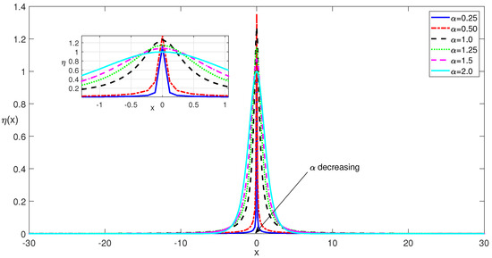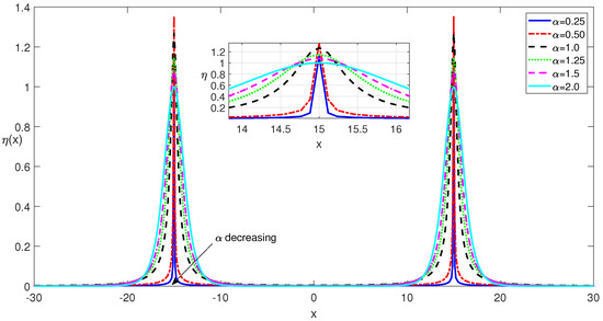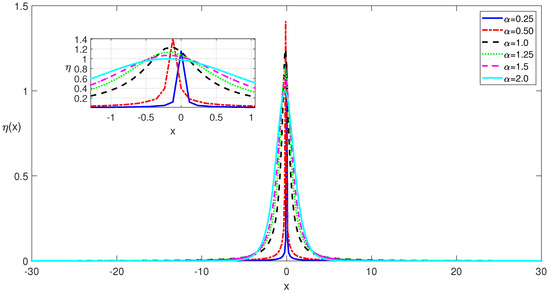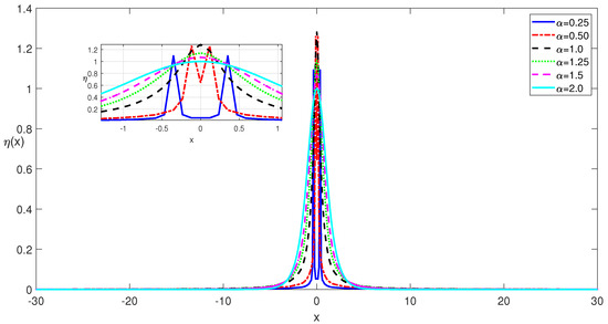 In this figure, the amplitude of the one soliton solution of the fNLSE obtained for the fractional-order is used as the normalization amplitude. Figure 1 confirms that a decrease in the fractional-order, , leads to significant changes in the soliton profile. The solitons obtained for smaller values are more peaked and slender, leading to a higher nonlinearity parameter. This increased slenderness behavior and significantly reduced soliton width can lead to many important applications in applied sciences. In nonlinear and fiber optics, and in hydrodynamics, the success of pulse/wave positioning, pinpointing, and matched filtering can be enhanced by adjusting the order of the fractional derivative, . Additionally, the increased slenderness of the solitons enhances their sparsity in the spatial and temporal domains. Higher sparsity of the soliton signals makes the usage of smart algorithms such as compressive sensing possible, bringing up many challenges [37,38]. Efficient analysis, measurement, interpolation, and extrapolation of solitons of the fNLSE are a few of the problems involving those challenges.