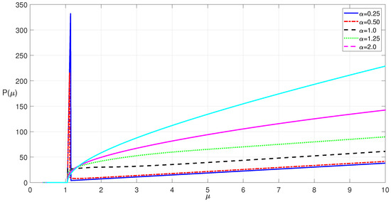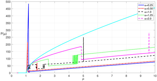 Although the solitons of the fNLSE with 1,2, or multi-peaks can be constructed using the PM method summarized above, their stability characteristics should also be investigated. For this reason, we refer to some studies in the literature that investigate the stability characteristics of solitons (see, e.g., refs. [34,35,36] and the references therein). Vakhitov–Kolokolov condition, also known as the slope condition [34], is one of the necessary conditions to be satisfied for the soliton stability. This condition dictates that for the soliton to be stable, the condition should hold true for the positive values of the soliton eigenvalue, [34]. Here, denotes the soliton power. To examine if the Vakhitov–Kolokolov condition is satisfied, we depict the soliton eigenvalue vs. power graphs in Figure 3 and Figure 4 for the one soliton and two soliton solutions of the fNLSE, respectively. For the range of soliton eigenvalues considered, which is , we observe that the Vakhitov–Kolokolov condition is satisfied with the exceptional regions and spikes in Figure 3 and Figure 4. The behavior and trend in the graphs are quite similar for the different values of the derivative fractional order, . Especially the graph for the one soliton case exhibits a smoother behavior. Since for the soliton eigenvalue of , the Vakhitov–Kolokolov is satisfied, the value of is used for computations presented in this paper.