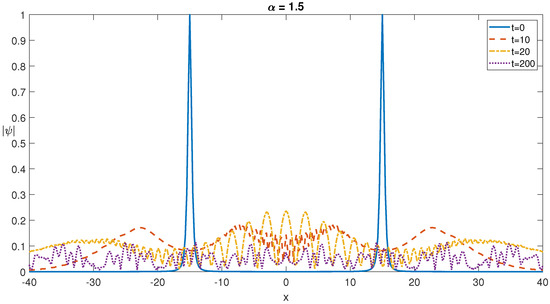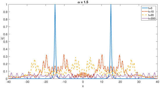 When the aforementioned computational approach is initiated using two Gaussians in the form of , the PM converges to self-localized two soliton solutions of the fNLSE. Two solitons of the fNLSE obtained this way are displayed in Figure 2 for various values of the fractional order, . Similar to the one soliton solutions, the two solitons presented in Figure 2 become more slender as the fractional order parameter, , decreases.