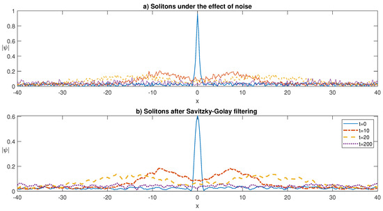 Next, we test the robustness of the soliton solutions against the noisy perturbations. With this motivation, we impose a white noise in the form to the wavefunction at every time step of temporal evolution, where the noise terms are and includes uniformly distributed random numbers in the interval of . As Figure 8 confirms, the soliton solutions of the fNLSE are robust against such perturbations and they remain bounded. No rogue wave patterns triggered by modulational instability are observed, including the long-time limiting case at which the profile resembles a sinusoidal waveform. In Figure 8, in the first subplot, the self-localized one soliton shape at different times under the effect of noisy perturbations is depicted. In the second subplot of Figure 8, the denoised soliton profiles at various times are presented. For the denoising process, we used a 3rd order Savitzky–Golay filter. As the figure indicates, the denoising filter can be used to filter the noise to obtain the fundamental characteristics and profiles of the solutions; however, such a denoising process can cause some reduction in the peak amplitudes of the solitons, which become even more pronounced for the lower values of the fractional-order . Similar behavior is also observed for the two soliton cases.