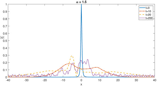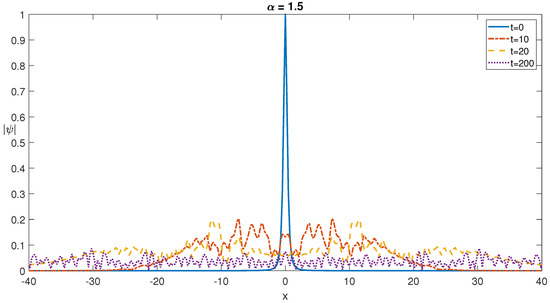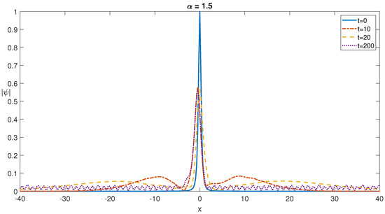 Lastly, we examine the effect of parameter of the q-deformed Rosen–Morse potential. The value of is reduced from 1 to 0.1, and solitons of the fNLSE obtained by PM and then time-evolved by fractional spectral method with 4th order Runge–Kutta time-integrator are depicted in Figure 14. Such a reduction in the parameters leads to a significant increase in the q-deformed Rosen Morse potential, and similar to the photorefractive potential case, low amplitude undulations with shorter wavenumber components become apparent on the main soliton profile. However, skewness and asymmetry of the wavefield are still observed.