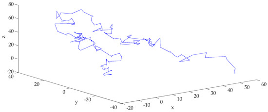 A three-dimensional fGPm random walk with 200 iterations is depicted in Figure 3. The particle is moving in the three-dimensional space, with the initial position as its origin. In each iteration of the random walk, the moving direction for the particle is random and the jump length is subject to fGpm. For the heavy-tailed stochastic process, the jump lengths are usually long, and the area of movement is vast.
