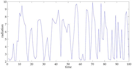 In order to validate our investigation, solar radiation forecasting is performed in the case study. The solar radiation is collected by the meteorological facility in Beijing, which can be found in the Supplementary Materials. The data for this is collected once a day. The radiation data from 1 July 2014 to 8 October 2014 are used as the training data. The training data are depicted in Figure 5, in which we can visualize the fluctuation of solar radiation.