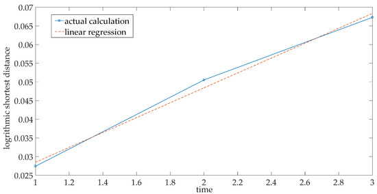 The logarithmic regression is plotted in Figure 6 for the shortest distance in the reconstructed phase space. As we can see from Figure 6, the slope of the straight line is the maximum Lyapunov exponent, which is 0.0199. First, we take the integral part of the reciprocal, then we can set the MPS to be 50 time steps.
