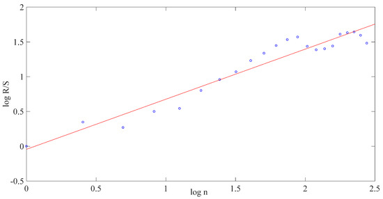 The Hurst exponent was calculated as the slope of the straight line (see Figure 7). An estimation of the Hurst exponent, evaluated by the R/S method, gives 0.7198. The value of the Hurst exponent verifies the long-range dependence and self-similarity of the data.