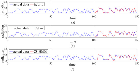(a) Forecasting the results for the hybrid approach; (b) forecasting results for the fGPm approach; (c) forecasting results for the CS-HMM algorithm.