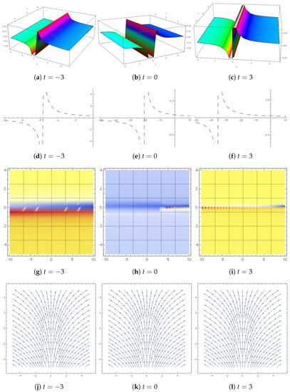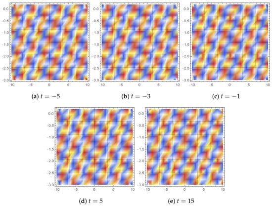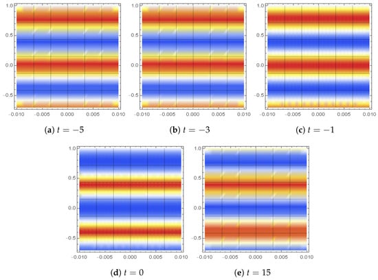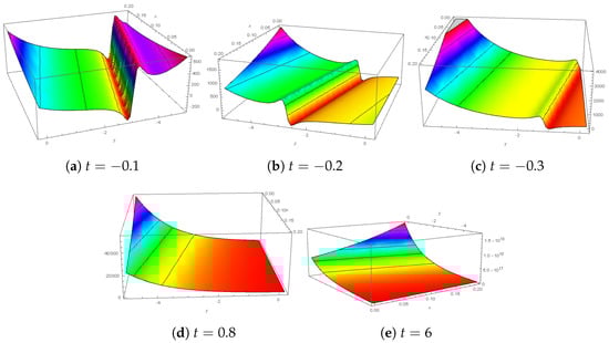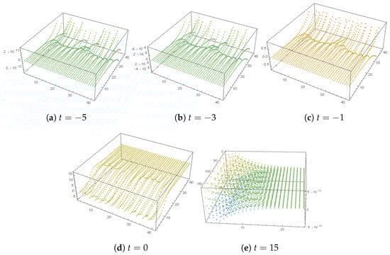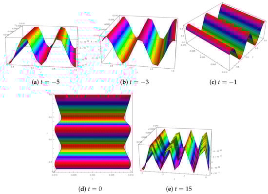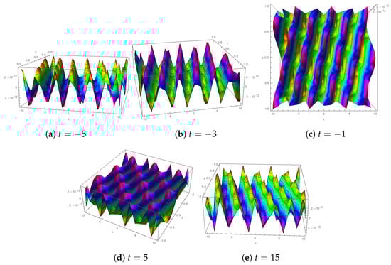 For finding numerical results, we have used the configuration of the Software MATHEMATICA:12.1 and MAPLE:14 to perform the simulation results. We have successfully obtained the stated forms of solutions and they show a discrepancy in the wave when setting the parameters to the appropriate values. First, by applying the three waves approach, we have evaluated three sets of solutions for Equation (1) and their graphs are constructed via appropriate values of involved parameters. Note that Figure 1 shows the 3D multiwave plots for in Equation (14) presented via numeric values , respectively. Figure 2 represents the 2D multiwave profiles for in Equation (14) via numeric values of . Figure 3 and Figure 4 interpret the density and stream plots for Figure 1. Furthermore, by utilizing the HB technique, we have computed three sets of solutions for Equation (1) and their plots are constructed. We have successfully evaluated the 3D HB profiles for , which are constructed with numeric values of , respectively, in Figure 5. The 2D HB plots for are displayed via numeric values of , respectively, in Figure 6. Similarly, Figure 7 and Figure 8 interpret the density and stream plots for Figure 5. We have attained four classes of M-shaped solitons via a suitable transformation in Equation (11). We have constructed M-shape evolution plots for , constructed with , in Figure 9. We have attained two classes of M-shaped solitons with one exp function via a suitable transformation in Equation (11). The resulting 3D interaction plots for are displayed with numerical values of in Figure 10 and Figure 11. Figure 12 and Figure 13 interpret the density and stream plots for Figure 10. We have computed two sets of solutions for M-shaped solitons with double exp function through a suitable transformation in Equation (11). The evolution profiles for are constructed with choice of in Figure 14. Furthermore, their stability characteristics are successfully manipulated. We believe that the results attained in this work will be helpful for recognizing rogue wave-like phenomena and many other novel interactional phenomena in shallow water waves.