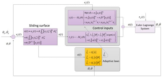 Intensive research attention focuses on the control of Euler–Lagrange systems [1]. Various methods in the literature have been proposed to handle the tracking problem, such as disturbance observer [11], sliding-mode approach [12], expanded proportional–integral controller [14], and adaptive fuzzy control [15]. Adaptive control, a well-recognized and widely used control method, is becoming increasingly prevalent in control engineering applications. It exhibits exceptional potential for adjusting to different environments under unknown and uncertain dynamics, hence enhancing the tracking performance of closed-loop systems [16]. Performance degradation and instability may result from parametric and non-parametric uncertainties; therefore, further developments in control theory are introduced to use adaptive control to deal with unknown uncertainties [13]. Moreover, sliding mode control (SMC) is a type of nonlinear robust control strategy. It is able to successfully control uncertain nonlinear systems with bounded disturbances and minimal sensitivity to changes in the system’s characteristics. Various advancements have been made for SMC, such as terminal SMC (TSMC), nonsingular TSMC, fast TSMC, integral TSMC, and fast nonsingular TSMC [17,18,19,20]. Furthermore, fractional-order (Fo) control has been incorporated with SMC to improve the performance of the controller [21,22,23]. Fractional-order control, which has been in use for the last three centuries and is concerned with derivatives and integrals of a non-integer order, was recently rediscovered by scientists and engineers and is being put to use in a variety of different fields [24,25,26,27,28].