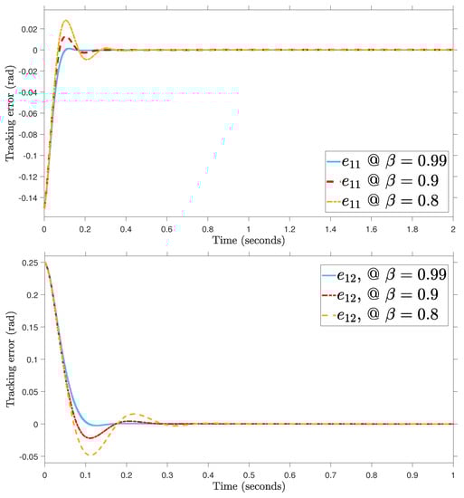 For the purpose of determining the appropriate value of , the angular position performance at the best value of is shown in Figure 3. It demonstrates that the appropriate fractional-order value, which can be chosen with ease, is 0.99 because the intended trajectories do not reach zero tracking errors at fractional-order values of 0.9 and 0.8.