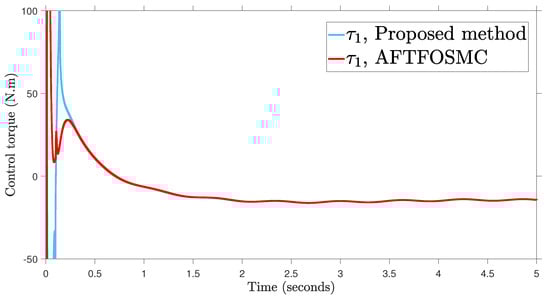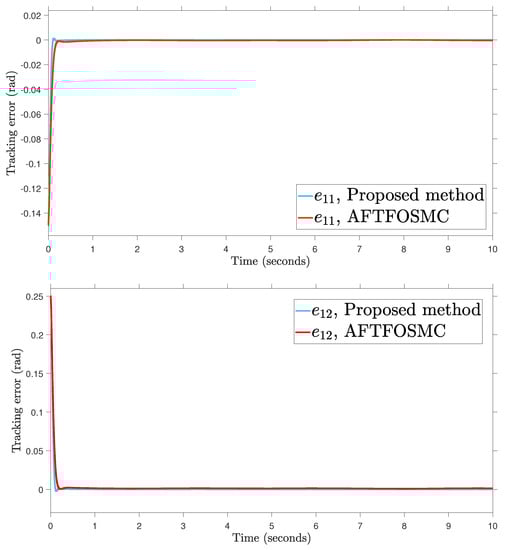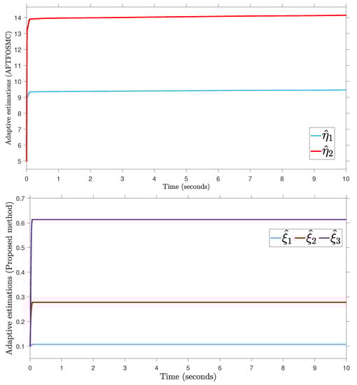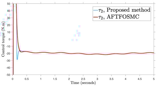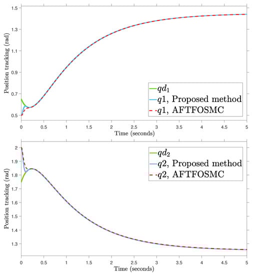 In this paragraph, the proposed AFoIFxTSM method is designed to adjust the uncertain dynamics of the 2-DOF robotic manipulator under unknown external disturbances. This is done in order to ensure that the robot is able to successfully complete its task. The compared simulations are performed with adaptive fractional-order sliding mode control (AFTFOSMC) [34] in order to provide more evidence of the viability of the designed technique. The values for (25) are chosen to be the same as (12), and the parameters of (27) are chosen as , , and . The results are compared between the suggested AFoIFxTSM scheme and the AFTFOSMC method in the presence of unknown dynamics to verify the performance of the desired trajectory tracking, tracking error, control torque inputs, and sliding surfaces presented in Figure 4, Figure 5, Figure 6 and Figure 7, respectively. Moreover, the quantitative results of the tracking errors in terms of the root mean square (RMS) are given in Table 3. And the depiction of the adaptive gains of the unknown parameters is shown in Figure 8.