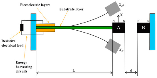 A bistable piezoelectric cantilever energy harvester is considered whose configuration is displayed in Figure 1 [17,19,20]. Here, the magnetic proof mass A is attached to the tip end of the horizontal beam, and the permanent magnet B with the same size is fixed on the base. The initial horizontal gap between the two magnets, namely, the initial distance, is denoted by d. The cantilever beam consists of a conductive substrate and two piezoelectric layers which are covered by thin electrode layers connecting to a resistive electric load. is the vertical displacement of magnet A at the moment . As visible in Figure 1, when the fixed end of the cantilever beam is excited in the vertical direction, the beam vibrates, and the subsequent strain energy can be transformed into electrical energy and then stored by the energy harvesting circuits. The magnetic restoring force plays a crucial role in determining the number of potential wells of the system. In a certain range of d, the configuration of the system by the interacting permanent magnets can support two symmetric stable equilibria, and [28].