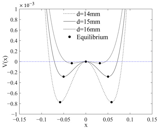 The equilibrium positions of the nondimensional system (4) can be determined by setting both sides of the above equation to zero. It is apparent that the values of v and y are both zero for the equilibria. The trivial (x, y, v) = (0, 0, 0) is definitely one equilibrium. Whether the system has nontrivial equilibrium depends on the value of the parameter a. For a positive a, there are two nontrivial solutions of the equation , denoted by ; thus, the unperturbed system has a pair of nontrivial equilibria (). Since the values of parameters , and L are given, whether p is positive depends on the value of the initial distance d. To get a positive p, 14 mm, 15 mm, and 16 mm are selected for d. On this basis, double potential wells can be configured, and in the Hamilton Equation (6), the Hamiltonian and the function of potential energy can be given by