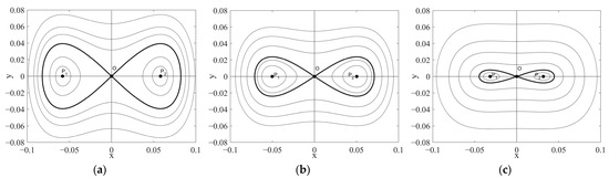 Unperturbed orbits for three different values of d: (a) d = 14 mm; (b) d = 15 mm; (c) d = 16 mm.