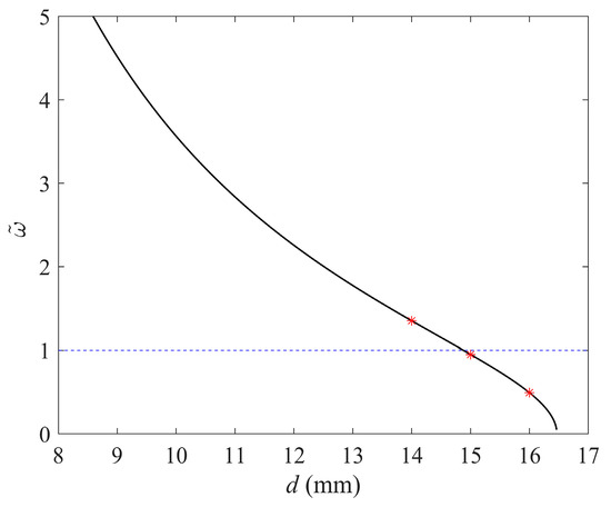 Based on the analysis above, we can illustrate the variations of the primary resonance responses with the local environmental excitation for three different values of the initial distance d. To begin with, we ought to compare the natural frequencies of the intra-well vibrations under different values of d, denoted by . This is because the energy harvesting efficiency will be undesirable if the natural frequency of the BPEH is much higher than the ambient frequencies which are usually low. The variation of the natural frequency with the increase of the distance d is delineated in Figure 4. It shows that monotonically decreases with d. In the comparison of under distances of 14 mm, 15 mm, and 16 mm (see the red star in Figure 4), it seems that the nondimensional natural frequency at d = 14 mm is much higher than 1, i.e. above the blue dash line in Figure 4, thus unsuitable for energy harvesting. Therefore, in the rest of this subsection, we just need to make a comparison for d = 15 mm and d = 16 mm.