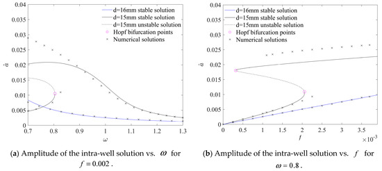 Noting the symmetry of intra-well responses surrounding the symmetric well centers, the amplitude variations of the intra-well responses with the nondimensional excitation coefficients at d = 15 mm and d = 16 mm are illustrated in Figure 5, where solid curves and dashed ones denote stable response branches and unstable ones, respectively. It follows from Equation (29) that SN bifurcation points to separate the stable and unstable branches are denoted by small red circles in Figure 5. Numerical results for stable periodic responses of the ordinary differential Equation (4) are simulated via the 4th-order Runge–Kutta method, namely, the software package ODE 45 in MATLAB, represented by the stars in Figure 5. As is evident from Figure 5, the analytical results agree well with the numerical ones. It should be noted that there is some decay between the analytical prediction and numerical examples under the circumstance of a much lower excitation frequency or a higher excitation amplitude ω, which can be ascribed to the limitation of MMS; in other words, the analytic results could be quantitatively precise only under the circumstance of weak nonlinearities, low excitation amplitudes, as well as the excitation frequency close to the resonant frequency. Actually, in the nondimensional BPEH oscillatory system (4), the nonlinear coefficient b for d = 15 mm and d = 16 mm is 179.1 and 121.7, implying a strong nonlinearity. Yet MMS is available, taking into consideration its valid qualitative prediction and the convenience it brings for achieving the approximate-analytical form of the primary resonant solutions.