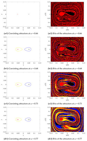 For a fixed , the sequence of the intra-well responses and their BAs with the growth of ω is shown in Figure 6 where ranges from 0.66 to 0.83, lower than 1. For , two intra-well attractors coexist in the vicinity of two different nontrivial equilibria , denoted by red and black colors, respectively (see Figure 6(a-1)). According to their BAs presented in Figure 6(a-2), the vicinity of each potential well center is single-colored, illustrating that both intra-well attractors have the local stability. In contrast, in the vicinity of the trivial , their BAs are intermingled, showing that a disturbance of initial conditions can trigger a jump between the two responses. Nevertheless, the two intra-well attractors are symmetric with the same amplitude. According to the analysis in the last section, the voltage amplitude in the BPEH is a proportional function of the amplitude of the final response x. Even though a jump between the two responses can stem from the disturbance of initial states habitually, the energy output will still be stable.