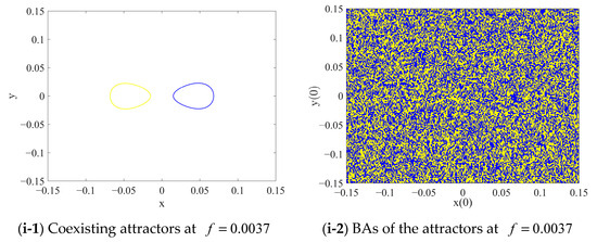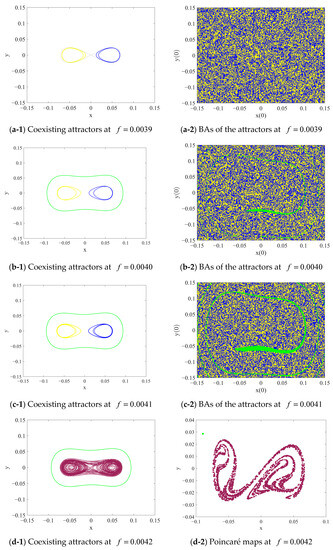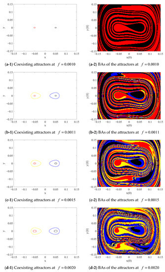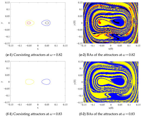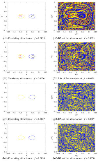 As is well known, homoclinic bifurcation of nonlinear dynamical systems usually leads to complex inter-well dynamical behaviors such as chaos. To find out the dynamic behaviors stemming from the global bifurcation, we now investigate the evolution of global dynamical behaviors and their BAs in the case that and the excitation amplitude f continues to increase (see Figure 9). For , similar as in Figure 7(i-2), there are bistable intra-well attractors whose BAs are both fractal and intermingled with each other. However, the two attractors are period-2 attractors whose phase loops are expanded and nearly touch the homoclinic orbits of the system (4), as shown in Figure 9(a-1).
