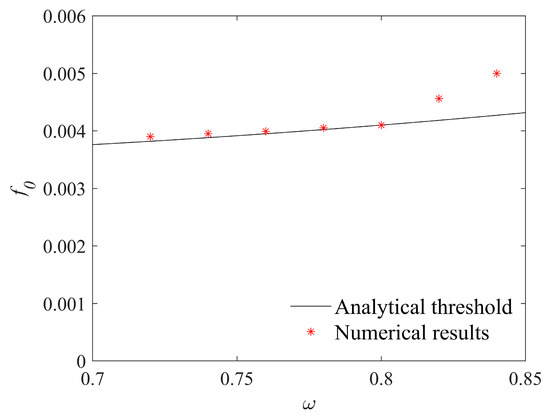 the nondimensional BPEH oscillatory system (4) will undergo a homoclinic bifurcation. Based on Equations (32), (35) and (37), one can find that the threshold for homoclinic bifurcation is a function of the nondimensional frequency of the external excitation . Since the values for the other coefficients in Equation (37) are given, we can obtain the variation of the threshold f0 for homoclinic bifurcation corresponding to different values of ω (see Figure 8). Theoretical prediction and numerical examples both imply that the excitation-amplitude threshold of homoclinic bifurcation monotonically increases with the nondimensional excitation frequency.