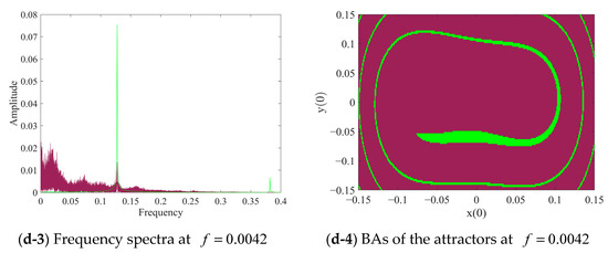 Finally, when is increased to 0.0042, namely, slightly more than the critical value of f for homoclinic bifurcation, the dynamical behaviors become more complex. The intra-well dynamical behaviors disappear; meanwhile, an inter-well chaos suddenly appears coexisting with the large inter-well periodic attractor, as evident from phase and Poincaré maps a well as spectrum analysis in Figure 9(d-1–d-3), respectively. Noticeably, the BA boundaries of the two inter-well attractors are smooth, as can be identified from Figure 9(d-4). This indicates the initial-state insensitivity of the final dynamical behavior, unlike chaos itself. It follows from Figure 9 that due to the homoclinic bifurcation of the system (4) induced by the increase of f, the system (4) will feature the coexistence of two inter-well responses, which contributes to the increase of energy harvesting output.
