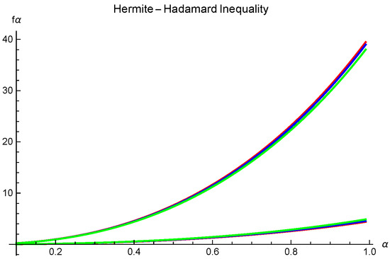 This figure describes the lower and upper bounds of the mean value integral, which is proved in Theorem 3. Here, red, blue, and green colours represent the left-, middle-, and right-hand sides of Theorem 3.