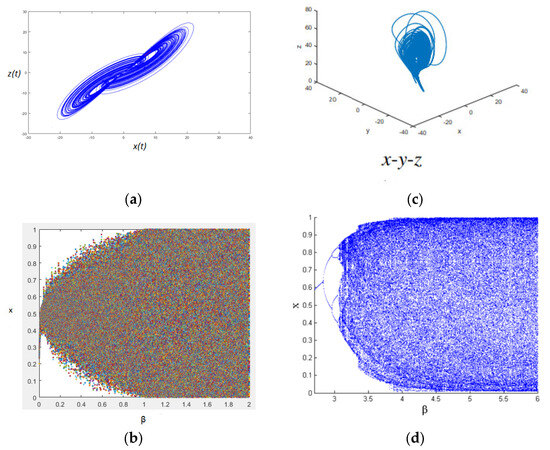 Chaotic behavior analysis result: (a) phase diagram of a Lü hyperchaotic system, (b) bifurcation diagram of a Lü hyperchaotic system, (c) phase diagram of a quantum logistic map, and (d) bifurcation diagram of a quantum logistic map.