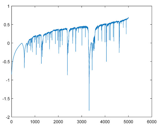 The quantum 3D logistic map is analyzed in terms of hyper-chaos attractors of the quantum logistic map and its bifurcation diagram, respectively, as shown in Figure 2c,d. Whereas Figure 3 depicts the Lyapunov exponents spectrum.