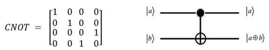 Step 8. The generated three different diffusion keys either with a quantum logistic map or Lü system as well as the original separated R, G, and B components of the color image are subjected to Hadamard transformation and the CNOT gate together in one quantum circuit to produce entangled qubits. Using a Hadamard gate followed by a CNOT gate will bring all values in all the resulted matrices into the zone of the superposition state and create entanglement. Hadamard gate H can be defined using Equation (3) in Section 2.2 and the action of the CNOT gate can be represented by its truth table alongside its quantum circuit, as shown in Figure 8 [57]: