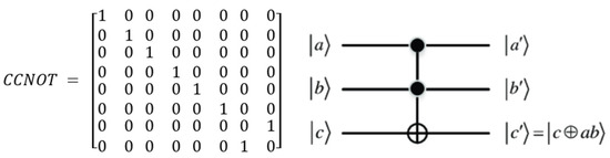 Step 9. Once all values of the three channels of the plain image and the three chaotic matrices obtained from either mathematical Formula (4) or mathematical Formula (5) are brought into a superposition state zone, a ternary Toffoli quantum gate is executed to modify the value of each pixel qubit. To effectively accomplish pixel-level diffusion, an XOR operation with the corresponding qubits of the three chaotic matrices obtained from either mathematical Formula (4), or mathematical Formula (5) must be performed. The quantum gate form of the Toffoli gate is often called CCNOT. Its quantum circuit diagram and its matrix can be illustrated as follows in Figure 9 [57].