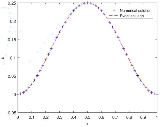 Let variables and T in problem (1) be equal to 1. The true solution of the problem is selected as , so we consider the following initial boundary value problem:
