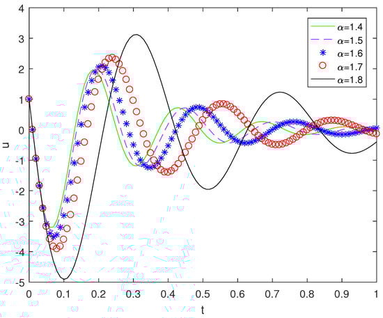 In this example, we assume the variables , , , and . The fractional derivatives are 1.4, 1.5, 1.6, 1.7, 1.8. The initial value , and the right end term .