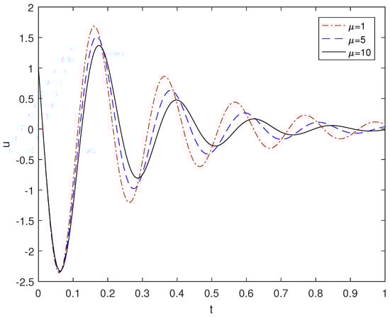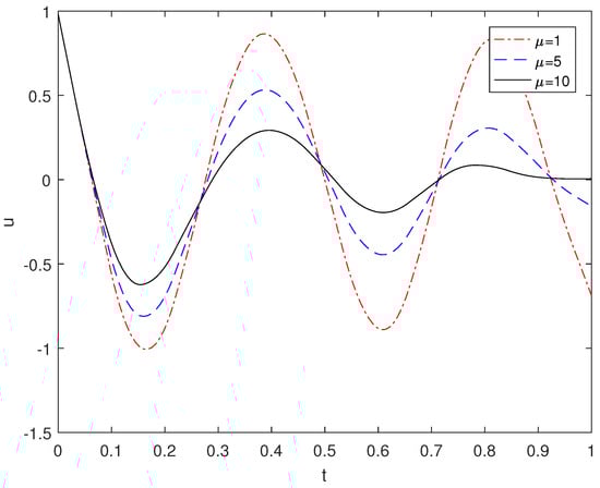 For the traditional damped beam model, we choose the same true solution, initial value and right end term as in Example 3. Take the midpoint of the beam to draw a graph and we obtain the following image of the displacement u changes with time t when the damping coefficient is 1, 5, 10. As can be seen from Figure 4, the amplitude of the beam decreases as the damping coefficient increases.
