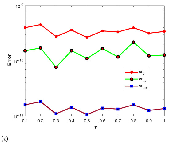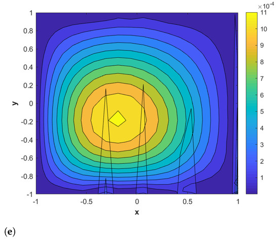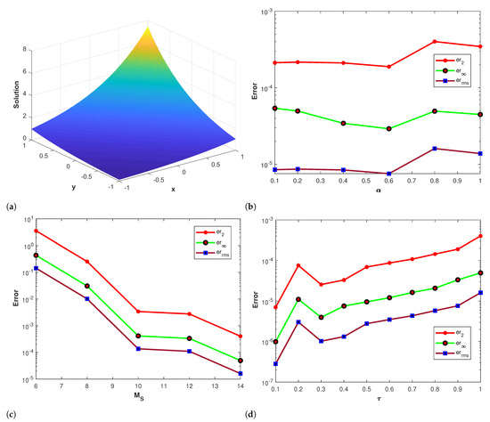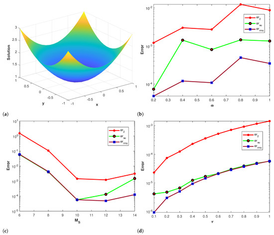 where and The forcing term and the initial-boundary data are extracted from the exact solution. The numerical results obtained via Talbot’s and Stehfest’s methods are presented in Table 3 and Table 4 by using different values for and n at The approximate solution obtained by the proposed method is shown in Figure 3a. The plots of the comparison of errors , and using Stehfest’s method for several values of , and τ at are shown in Figure 3b–d, respectively. Figure 4a–c show the plots of errors , and by using Talbot’s method with different values of , and τ at Figure 3e presents the contour plot of the absolute error obtained by using Stehfest’s method for different values of α with , and The accuracy of Stehfest’s method enhances for and then gradually diminishes for values exceeding . From all of the obtained results presented in the figures and tables, we conclude that the proposed method is stable, accurate, and efficient. Clearly, the results show that the accuracy of Talbot’s method is better than that of Stehfest’s method.