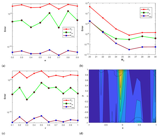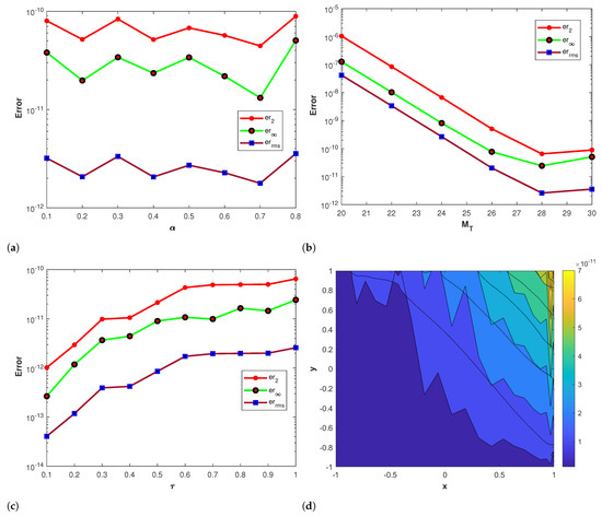 where and The forcing term and the initial-boundary data are extracted from the exact solution. The numerical results obtained via Talbot’s and Stehfest’s methods are presented in Table 5 and Table 6 by using different values of with n at The approximate solution obtained by the proposed method is shown in Figure 5a. The plots of the comparison of the errors , and using Stehfest’s method for several values of , and τ at are shown in Figure 5b–d, respectively. Figure 6a–c show the plots of errors , and via Talbot’s method with different values of , and τ at Figure 6d presents the contour plot of the absolute error by using Talbot’s method for different values of α with , and The accuracy of Stehfest’s method enhances for and then gradually diminishes for values exceeding than . From all the obtained results presented in the figures and tables, we conclude that the proposed method is stable, accurate, and efficient. Clearly, the results show that the accuracy of Talbot’s method is better than that of Stehfest’s method.