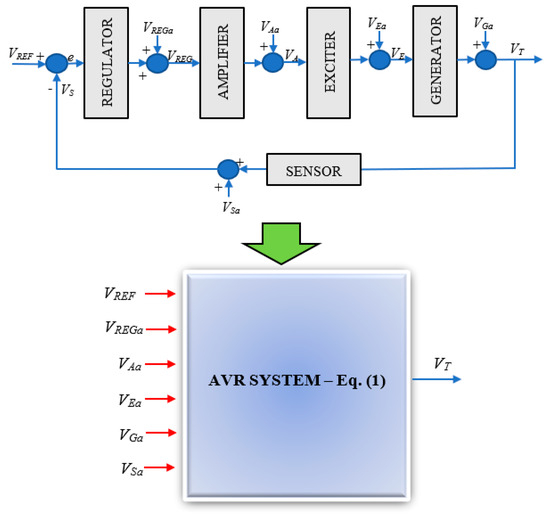 A synchronous machine, an amplifier, an exciter, a controller, and a sensor form the excitation control system. The synchronous machine is the main source of energy for electric energy systems (EES). The excitation of the synchronous machines is powered by a rectifier bridge (also referred to as an exciter). The regulator determines the control signals, while an amplifier device regulates the control angles. A sensor is used to measure the generating voltage. Figure 2 illustrates the block diagram of the AVR structure together with all the potential disturbances. The character “a” stands for the signal for a disturbance in each element in this figure. Each element is linearized using a first-order transfer function, as presented in the research works that address the AVR model [3,4,5,6,7,8,9,10,11,12,13,14,15,16,17,18,19,20,21,22,23,24]. In this way of linearization, each part is very simple and does not have many physical nonlinearities. The mathematical expressions and descriptions of elements are given in [3,4,5,6,7,8,9,10,11,12,13,14,15,16,17,18,19,20,21,22,23,24,25]. Table 3 provides values of the overall gain and time constants for each element.
