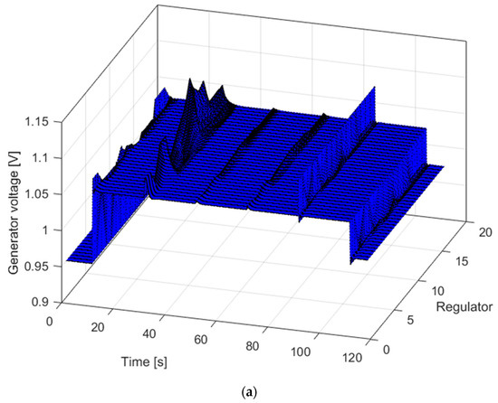- It was observed how the generator voltage responded to the generator voltage’s reference value, which ranged from zero to one, while a step disturbance was present. In papers [3,4,5,6,7,8,9,10,11,12,13,14,15,16,17,18,19,20,21,22,23,24], this change in the reference value is illustrated.