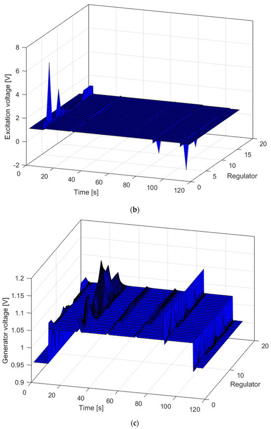 Applying the proposed algorithm, the PIDD2 regulator parameters are determined for the various maximum values of the excitation voltage based on the previously observed findings. The maximum value was explicitly determined to be 4 pu, 3.5 pu, 2.5 pu, 2 pu, and 1.6 pu. In other words, we used the same parameter limits as in the other works [3,4,5,6,7,8,9,10,11,12,13,14,15,16,17,18,19,20,21,22,23,24,25]. Table 5 lists the regulator’s determined parameters. As noted, the lower excitation voltage results in lower values for all regulator parameters. In [22], the same finding is shown for different types of regulators when it comes to how the excitation voltage value affects the regulator parameter values.