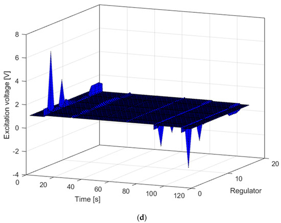 Three-dimensional dependence: (a) generator voltage, time, and regulator for step changes of 5%, (b) excitation voltage, time, and regulator for step changes of 5%, (c) generator voltage, time, and regulator for step changes of 7%, (d) excitation voltage, time, and regulator for step changes of 7%.