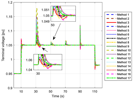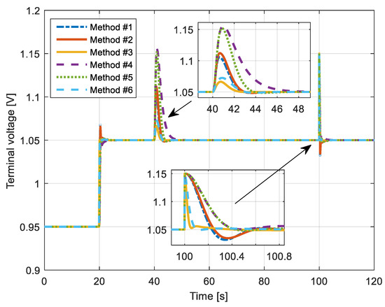 Terminal voltage response for regulator parameters based on Methods #1–6 (in 20 s—the effects of generator voltage reference change, in 40 s—the impact of the additional signal on the regulator output, in 100 s—the impact of the additional signal on the generator output).