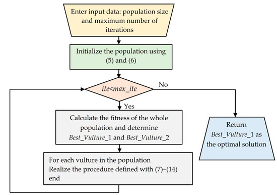 After this step, the next step is calculating the fitness value of all vultures. In this step, the division of vultures must also be realized—the vulture with the lowest fitness value is chosen to be the best vulture of the first group (marked as Best_Vulture_1), while the second-best vulture from the whole population is selected as the second group’s best vulture (marked as Best_Vulture_2). Also, in this step, it is necessary to randomly choose one of the best vultures from these two groups (this random vulture is denoted as R(i)):