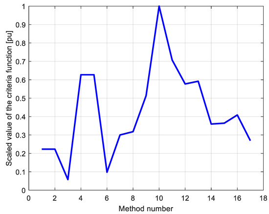 First, using the proposed objective function and all of the regulator parameters listed in Table 1—all derived from the literature—the value was determined for each regulator type. The results of applying this suggested objective function are shown in Figure 6, where the value of the proposed objective function was scaled to the highest value attained by the methods in the literature (in this case, Method #10 in [26] provides the highest value of the criterion function). In all the observed methods, it is clear that the methods presented in [25] provide the best results.