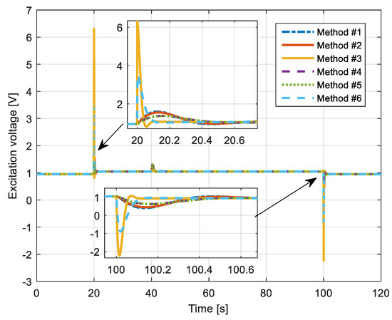 Figure 7 and Figure 8 show the generator voltage response to the disturbances above, as well as the corresponding excitation voltage. As can be seen, Method #3 allows for the results to be obtained when the excitation voltage reaches its maximum value during the transition process and is more than 6 pu. Method #6 uses an excitation voltage that is at its highest value during the transition process—3.5 pu. Even though it is not safe or secure, the higher excitation voltage value during the transition process makes it possible for the generator voltage to respond more quickly. When the excitation voltage is within acceptable ranges, other methods can be used to get good results. However, the process of transitioning in these methods takes longer than the process taken using Methods #3 and #6.